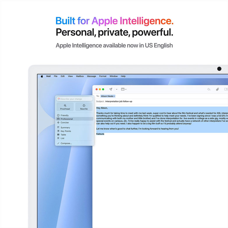 Apple Intelligence is the personal intelligence system that helps you write, express yourself, and get things done effortlessly. With groundbreaking privacy protections, it gives you peace of mind that no one else can access your data -not even Apple