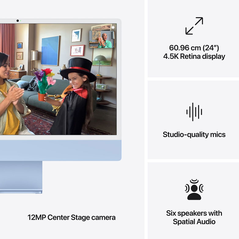 Intelligent Camera SetupEquipped with a 12MP Center Stage camera, this 24-inch iMac makes video calls engaging. The camera’s Desk View function ensures you stay centred, and its enhanced image signal processor offers optimum video quality through computational video techniques. Furthermore, the iMac supports 1080p HD recording, which allows for professional-looking video calls and presentations. So, whether for work meetings or personal chats, the camera setup delivers an engaging experience.